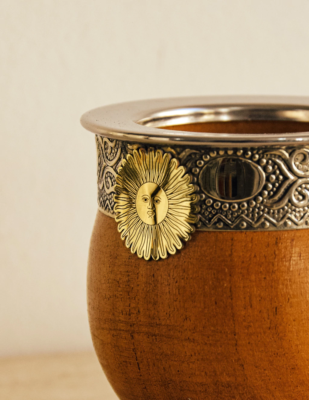 Este diseño une la nobleza de la madera con un aplique en bronce del Sol de Mayo, símbolo máximo de la bandera argentina, logrando un mate con identidad nacional y estilo inconfundible.